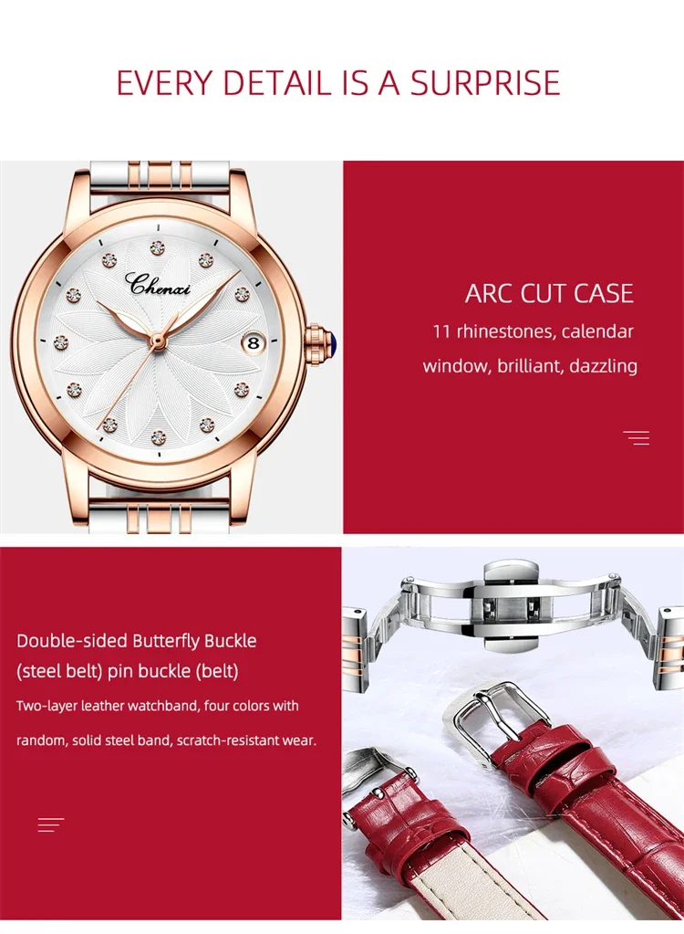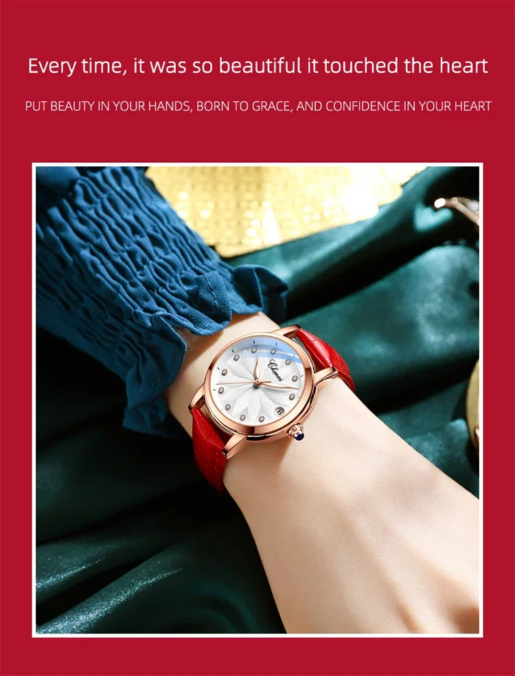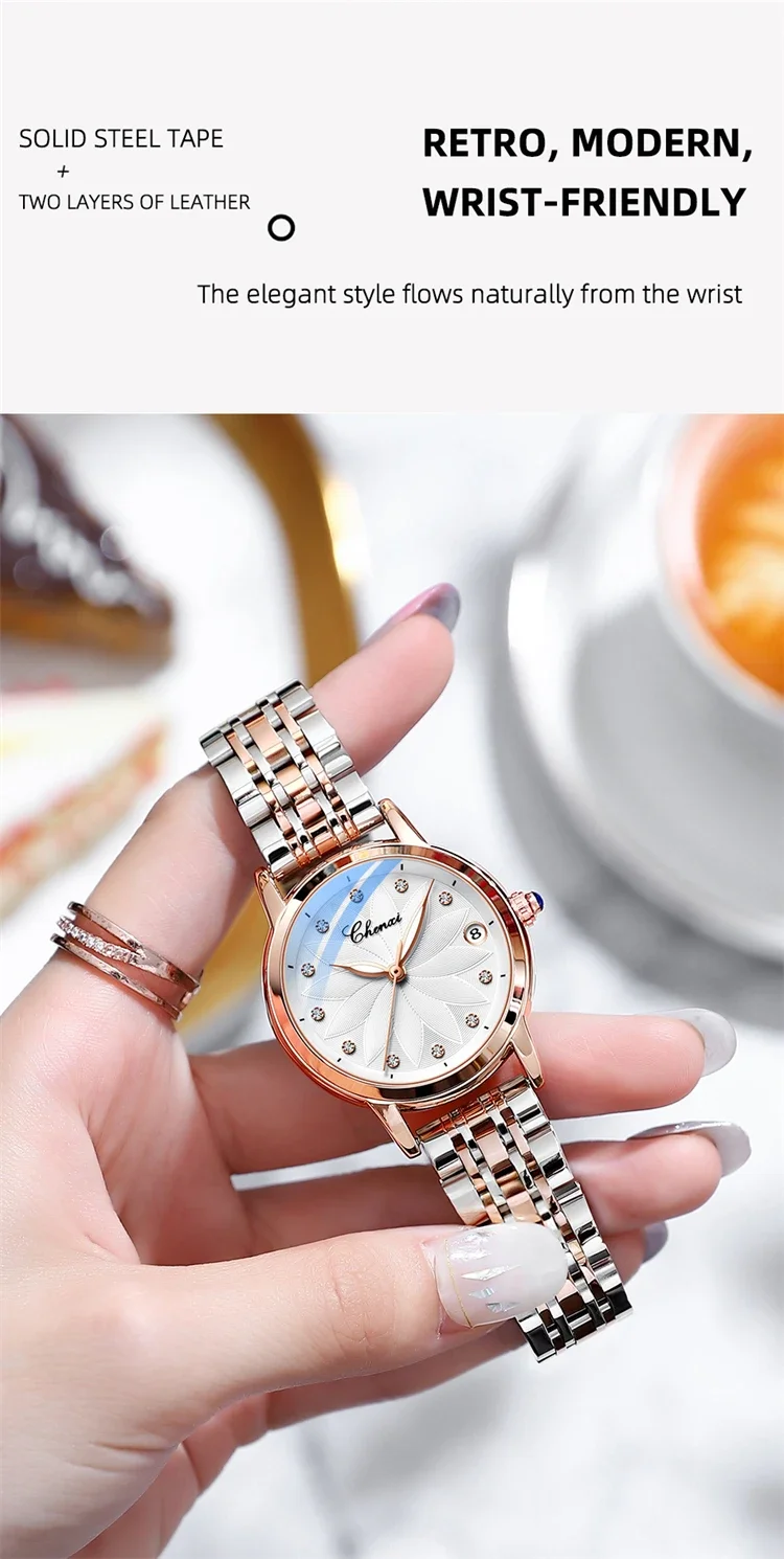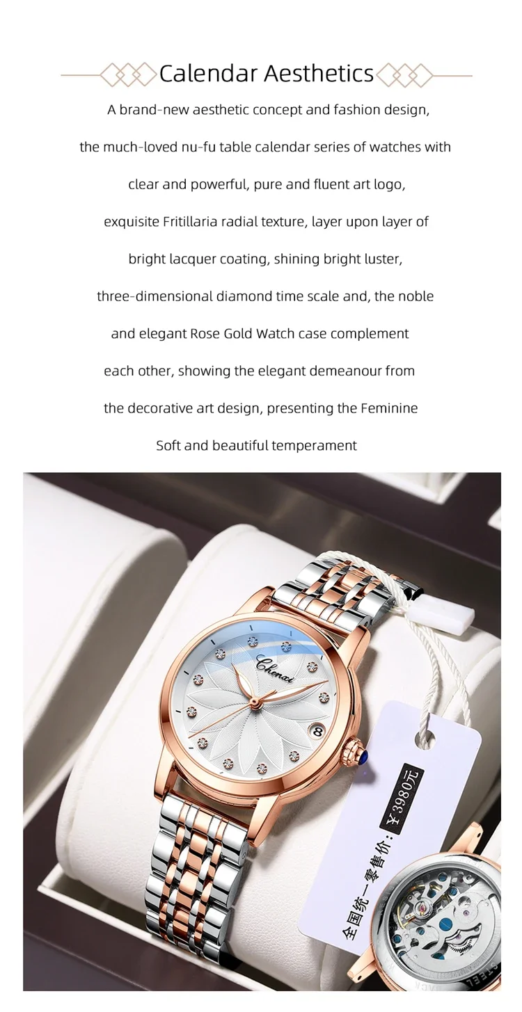 The CHENXI 8833 is a striking blend of elegance and mechanical artistry, crafted for women who appreciate sophistication with a touch of boldness. Featuring a polished round case and genuine leather strap, this timepiece pairs classic luxury with modern simplicity. The minimalist dial glimmers with diamond-style accents and luminous hands, creating a refined sparkle and effortless readability in any light. With its graceful curves and elevated design, it transitions beautifully from business attire to evening elegance.