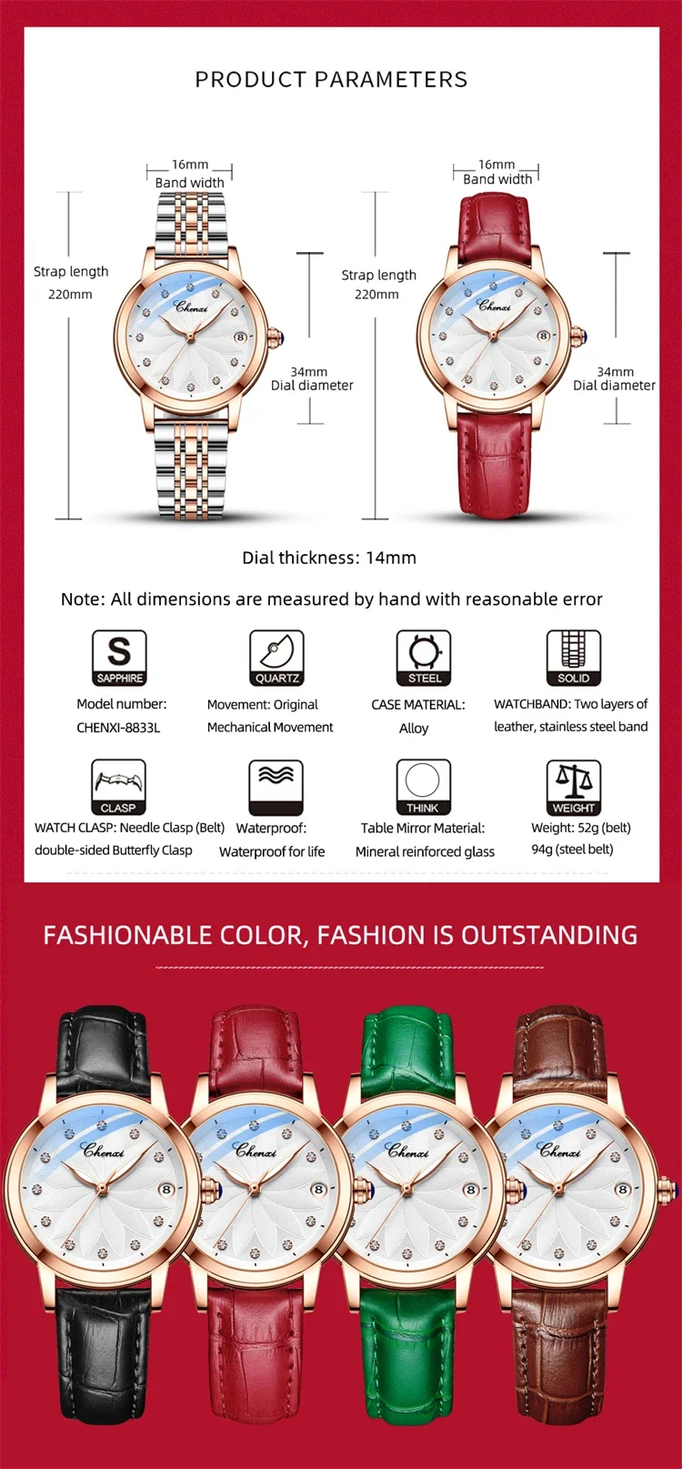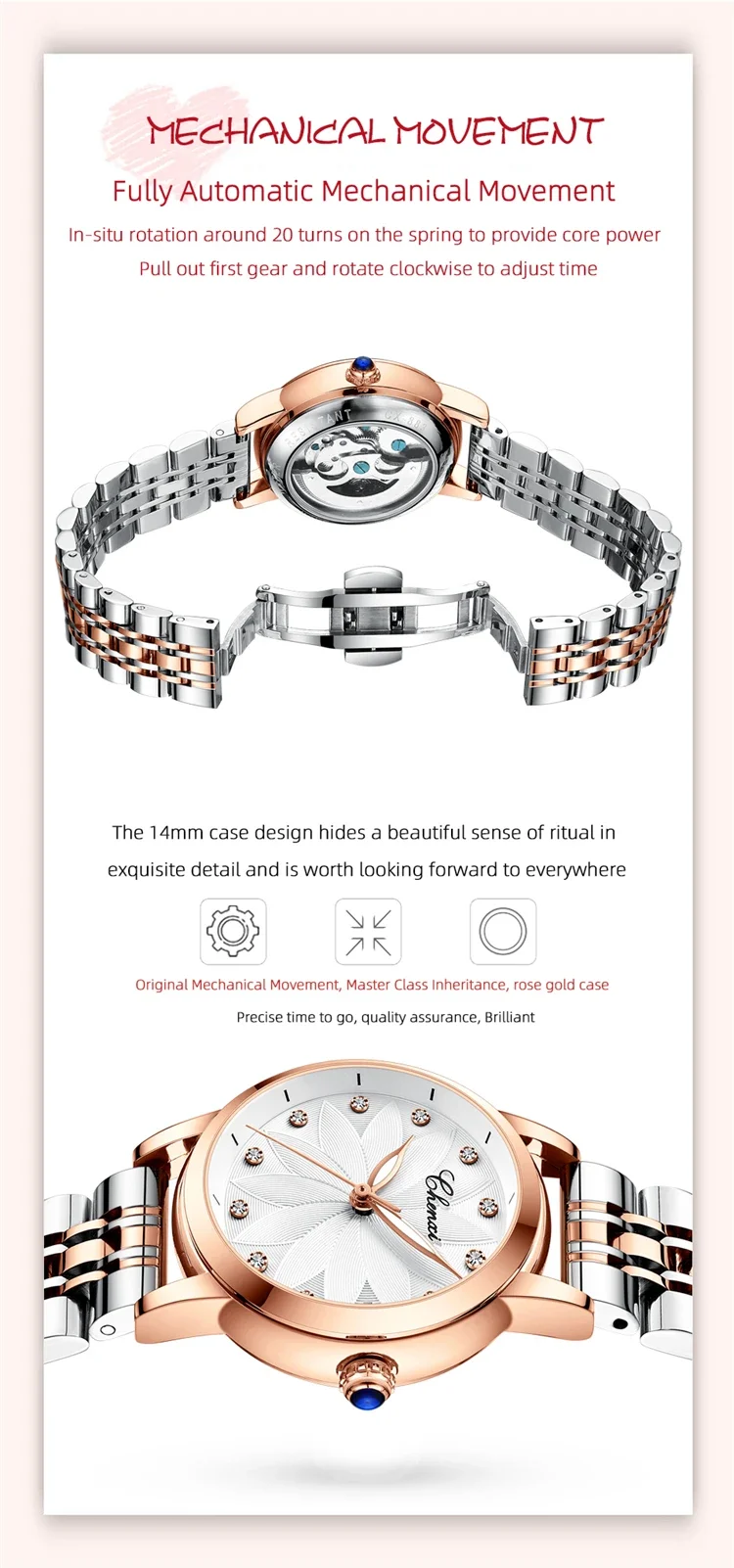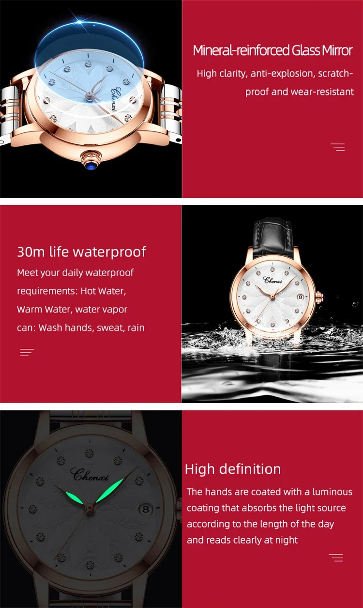 The CHENXI 8833 is a striking blend of elegance and mechanical artistry, crafted for women who appreciate sophistication with a touch of boldness. Featuring a polished round case and genuine leather strap, this timepiece pairs classic luxury with modern simplicity. The minimalist dial glimmers with diamond-style accents and luminous hands, creating a refined sparkle and effortless readability in any light. With its graceful curves and elevated design, it transitions beautifully from business attire to evening elegance.