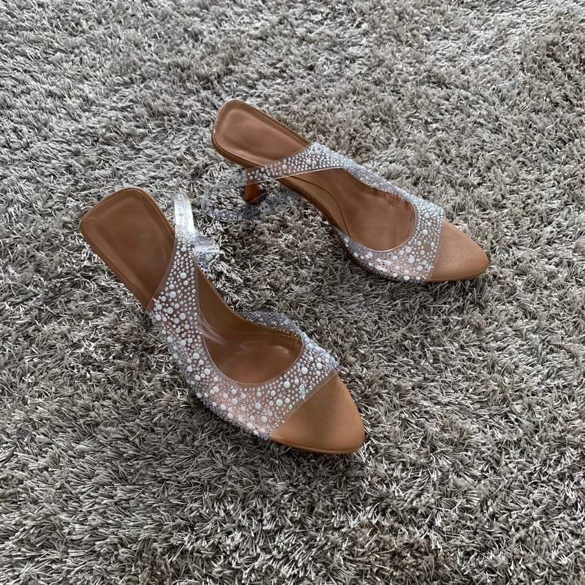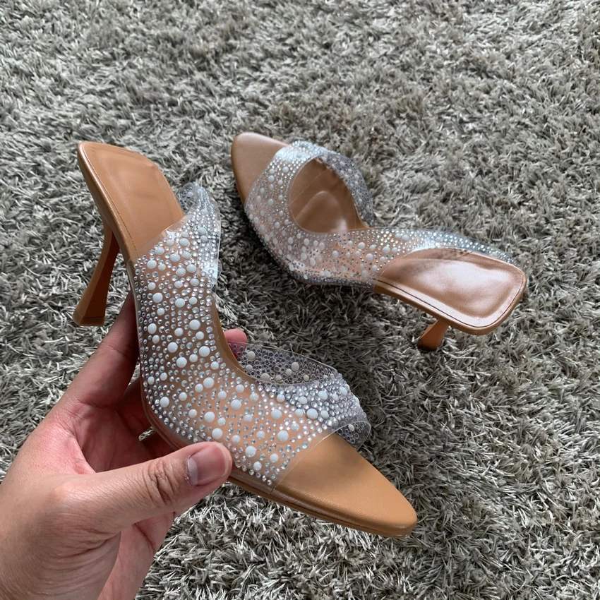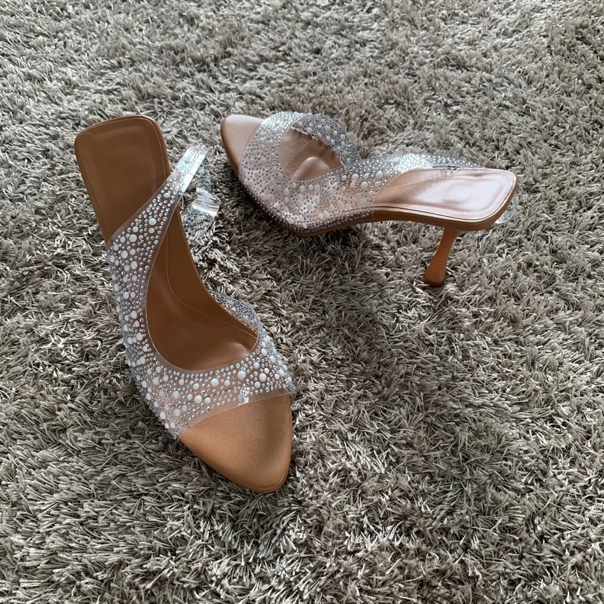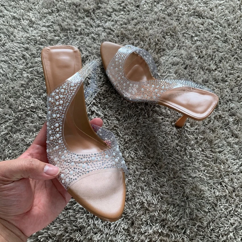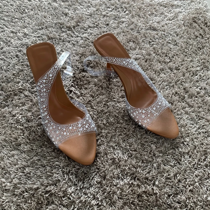 Crafted with sleek PVC uppers and a soft bonded leather interior, these heels balance allure with comfort. The covered sides enhance stability while maintaining a sensual, modern design. Whether paired with a cocktail dress or a flowing gown, these heels bring the perfect blend of sparkle, style, and sophistication to your look.