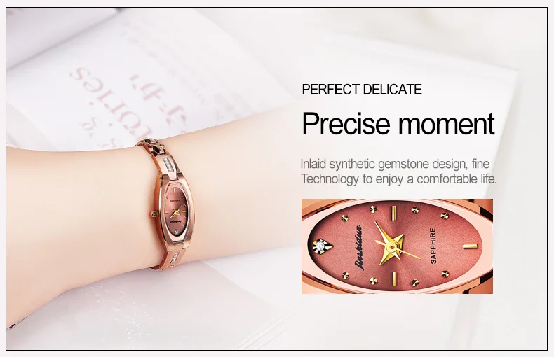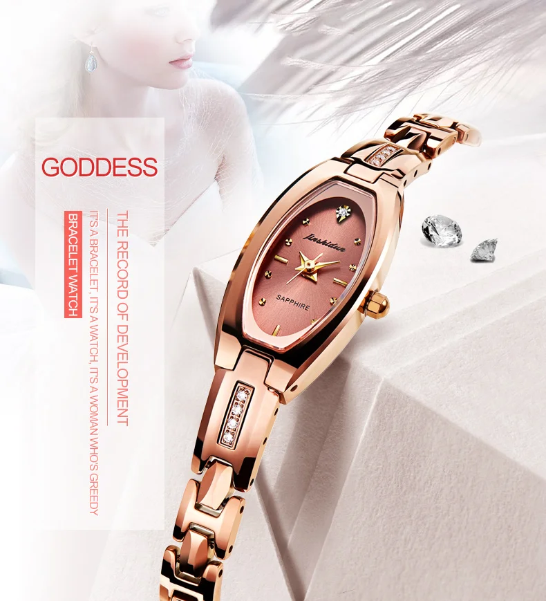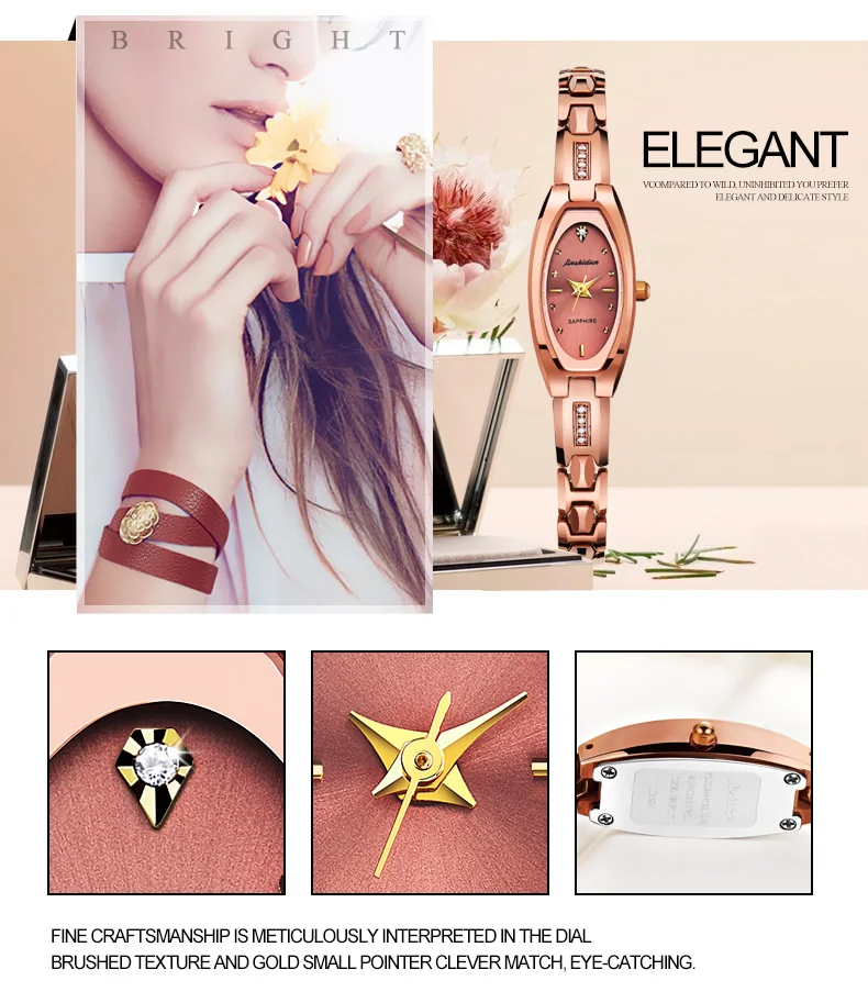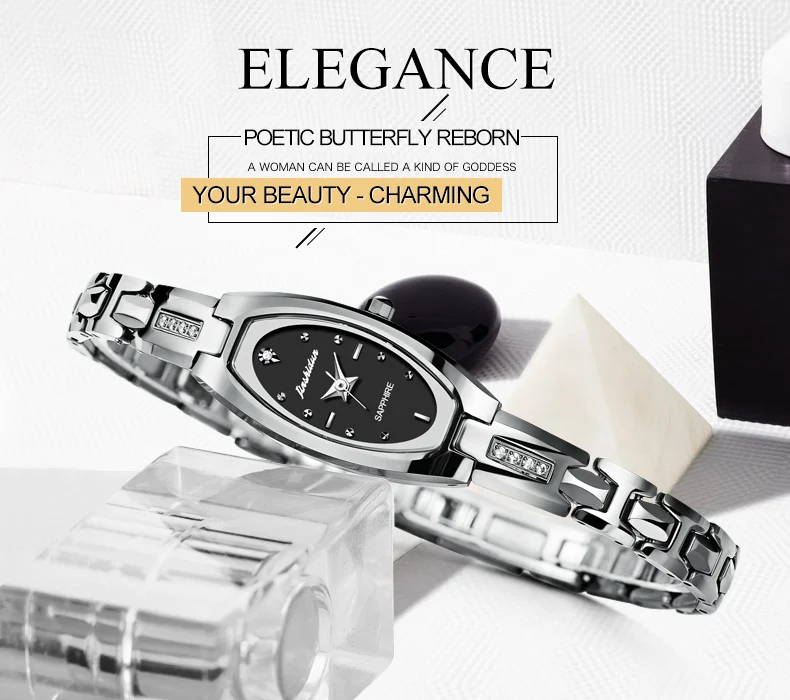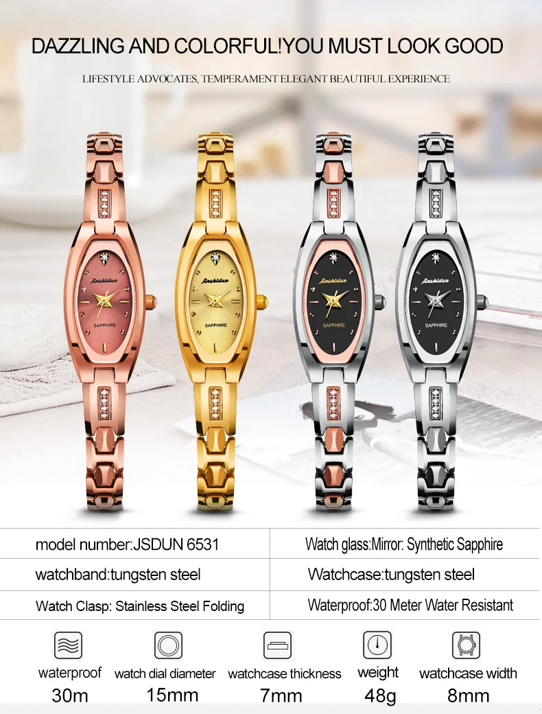 Discover refined luxury in a beautifully compact form with the JSDUN 6531, a timepiece created for women who appreciate elegance in every detail. Crafted from premium tungsten steel, its sleek oval case and matching bracelet deliver a polished, modern look with exceptional durability and lasting shine. The minimalist numberless dial, paired with shimmering diamond-like accents, adds a touch of quiet glamour, while the sapphire-crystal window provides clarity and scratch resistance for lasting brilliance.