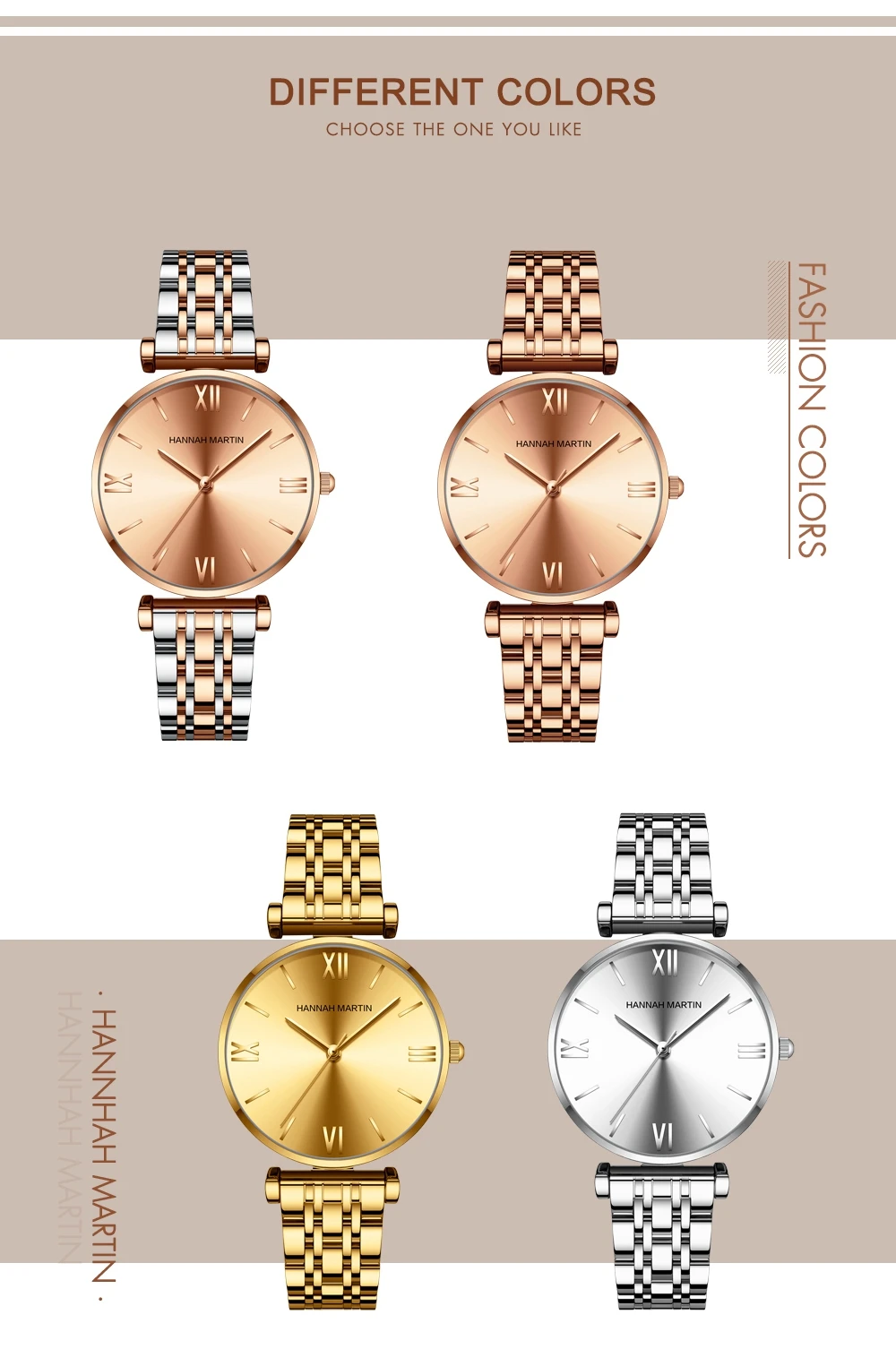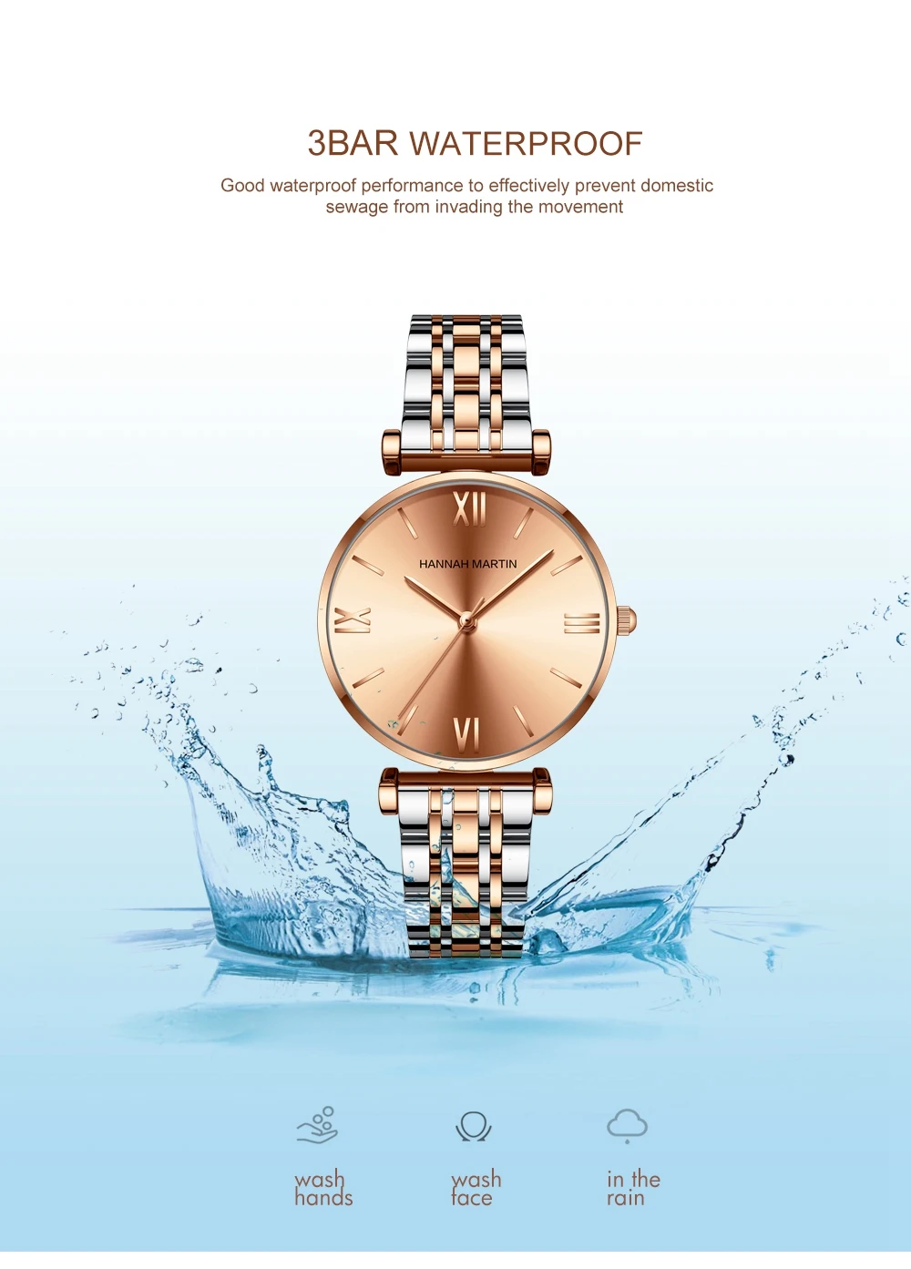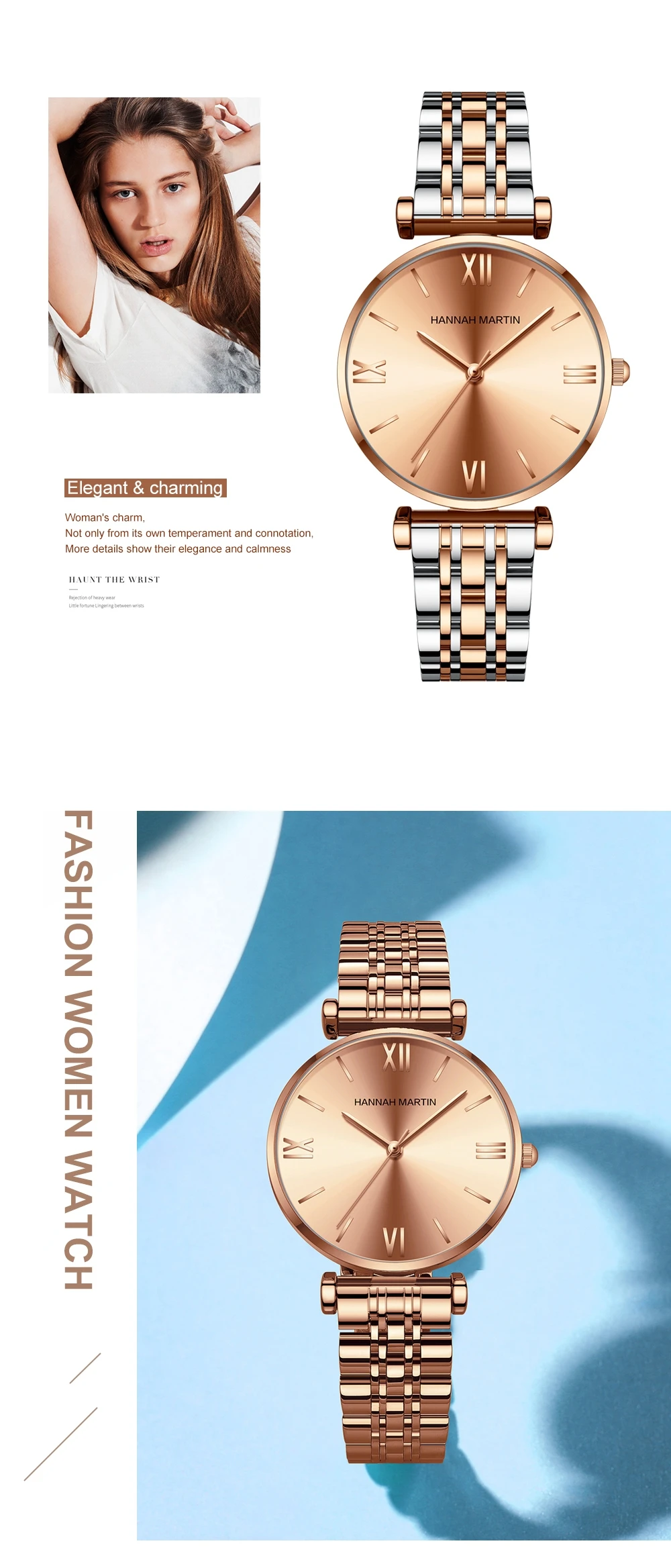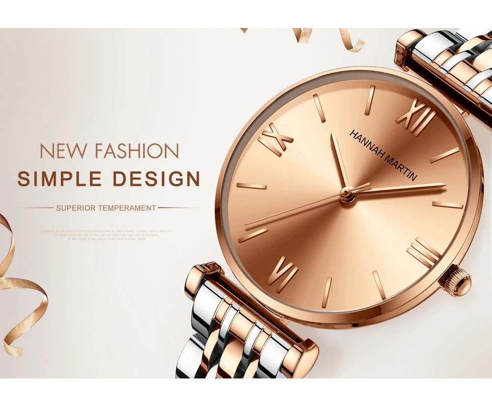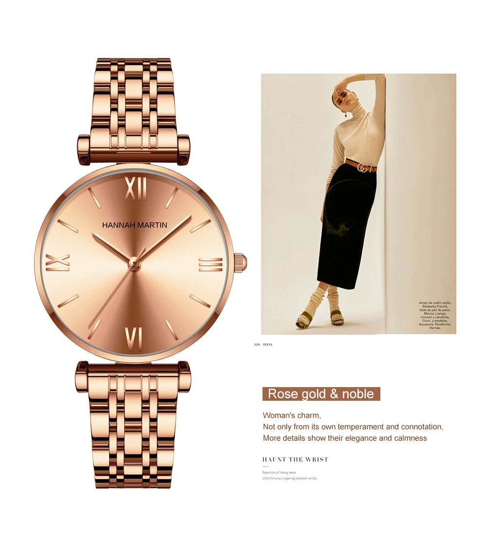 The Hannah Martin 1522 brings timeless elegance together with a modern, refined finish, creating a watch that feels both classic and contemporary. Its polished round case and softly curved stainless-steel bracelet reflect a luxurious shine, while the minimalist numberless dial and slender hands offer understated sophistication. The warm rose-gold tone adds a touch of romance and fashion-forward charm, making it a perfect centerpiece for both daily looks and special occasions.